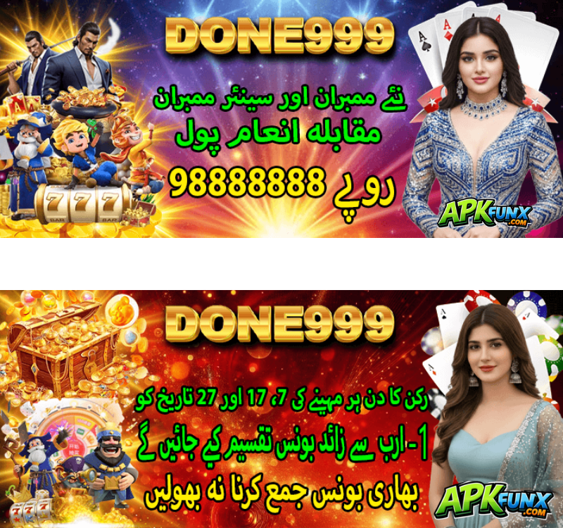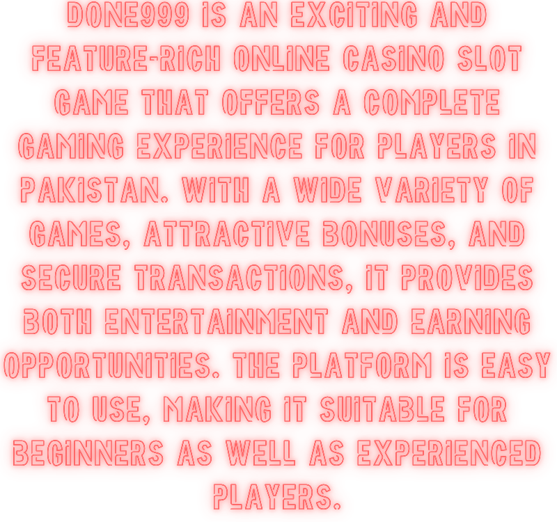 Done999 is an exciting and feature-rich online casino slot game that offers a complete gaming experience for players in Pakistan. With a wide variety of games, attractive bonuses, and secure transactions, it provides both entertainment and earning opportunities. The platform is easy to use, making it suitable for beginners as well as experienced players.